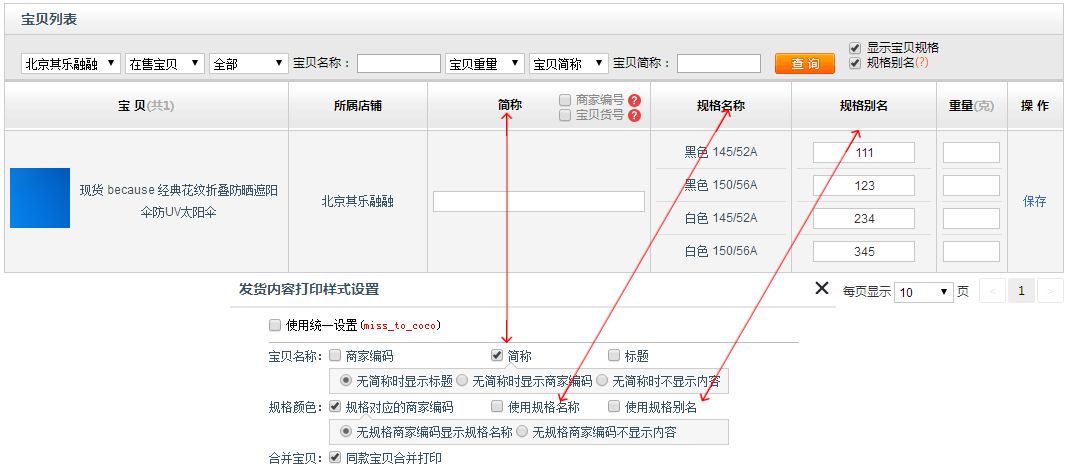 一、设置打印内容 进入快递助手,查询订单,点开订单详情,点击打印内容,勾选您需要的显示方式(一般标题字数过长可以选择宝贝简称)。勾选好后,点击保存。可以在详情下方查看发货内容。(一个订单设置好发货内容,其他订单也会根据您勾选的信息显示发货内容) 二、设置快递单模板 打开快递单设置,编辑此模板,新增数据框,勾选发货内容 设置好之后,快递单上就会出现宝贝信息啦~ 那么当标题过长,如何设置显示宝贝简称或者宝贝商家编码呢? 1、宝贝简称的设置: 路径:快递助手-宝贝简称 在系统内将不同的宝贝设置成您需要的简称信息,点击保存。 2、商家编码设置: 路径:卖家中心-宝贝编辑页面-设置商家编码 点击链接直达: https://sell.taobao.com/auction/merchandise/auction_list.htm?spm=a313o.201708ban.favorite.d45.64f0197ayRESdZ 软件中自动同步淘宝后台设置好的商家编码 宝贝简称菜单下面还可以按需求设置宝贝规格/规格别名/重量 1、什么情况下使用规格别名? 单个宝贝下的sku名称过长,规格别名相当于是sku的简称 2、什么情况下标注重量? 重量主要用于快递单对账(大致的重量知道了和快递称的重量做对比,差太多就有问题了),这里只能记录包裹的大致重量,因为包裹的盒子重量没有办法准确记录。 所有想要展示在快递单上的信息都可以这样操作实现哦,现在您知道如何将宝贝信息打印在快递单上了吗?有不理解的欢迎咨询快递助手客服哦~ 客服旺旺:黑色木屐 客服qq: 800172023 联系电话:0571-81185661